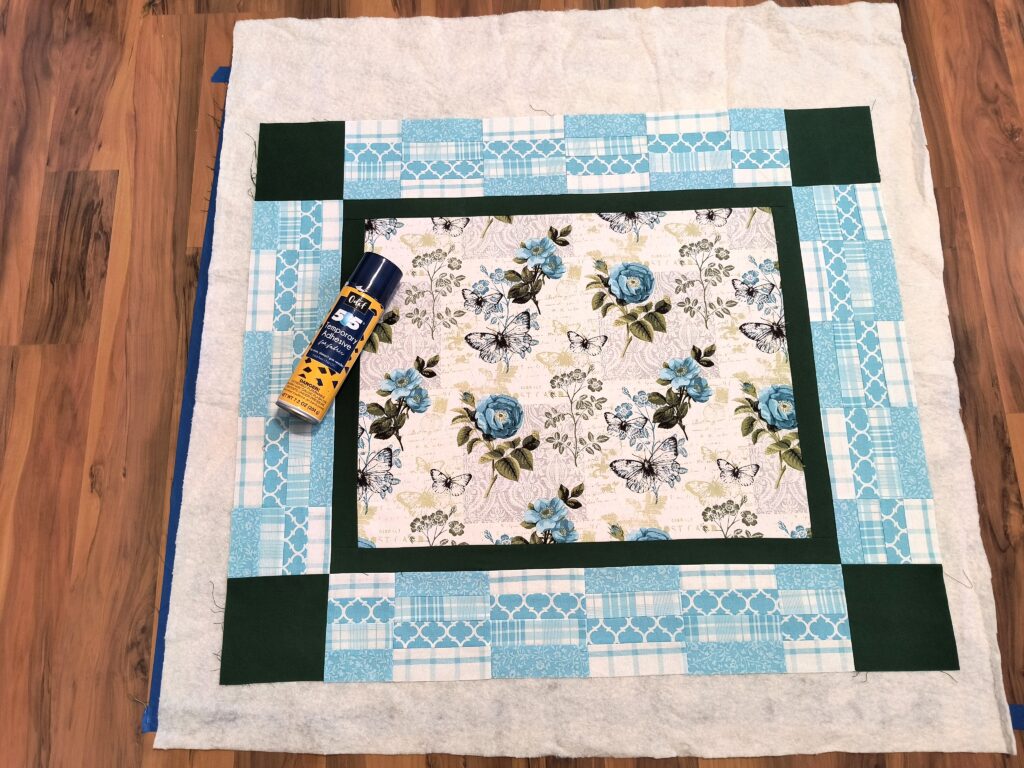 Basting spray is another way to hold the quilt sandwich together. It is faster and works well, especially if you don’t have any friends around to help you pin! It’s important to keep all layers smooth without wrinkles.